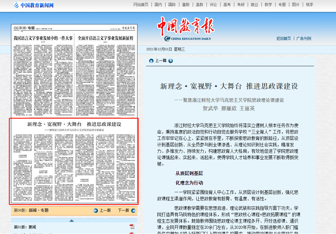 12月1日,《中国教育报》第六版以《新理念·宽视野·大舞台推进思政课建设为》为题,从理念引领、课程改革、教学育人、实践教学等四方面详细报道了我校思政课建设和教学改革的特色亮点。报道指出,浙江财经大学在习近平总书记3·18重要讲话精神和“三全育人”的理念指引之下,不断探索思政教育新路径,...