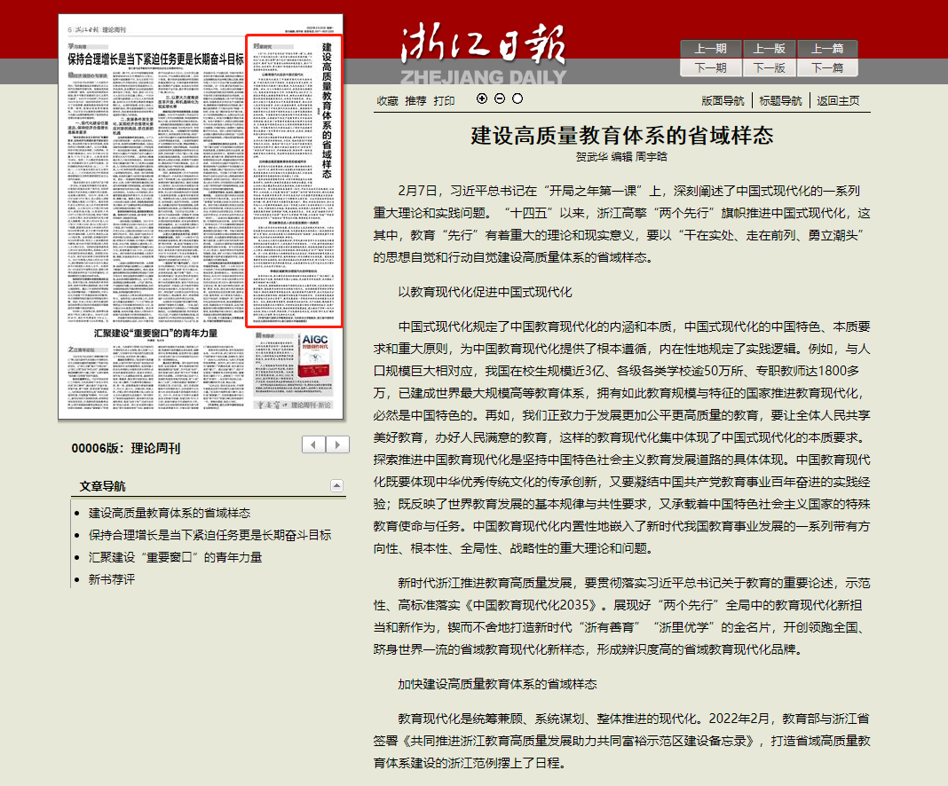 《浙江日报》2023年2月20日第6版全文刊发了肉漫画 贺武华教授的文章:《建设高质量教育体系的省域样态》,全文如下: