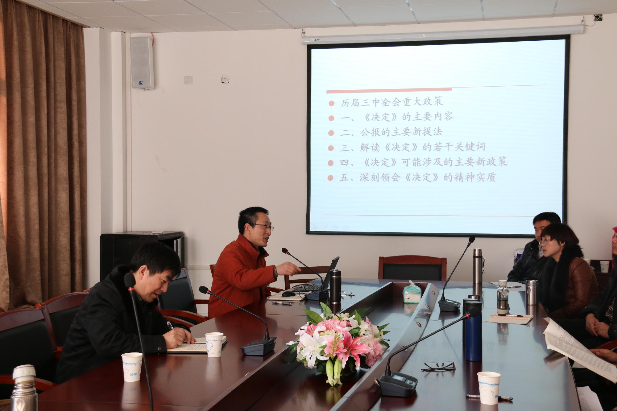 12月10日下午,思政部在3号学院楼211会议室召开学习宣传十八届三中全会精神辅导报告会,思政部党总支副书记、副主任何历宇教授作题为十八届三中全会《中共中央关于全面深入改革若干重大问题的决定》解读的报告会,思政部全体教职工参加大会,思政部主任华正学教授主持会议。