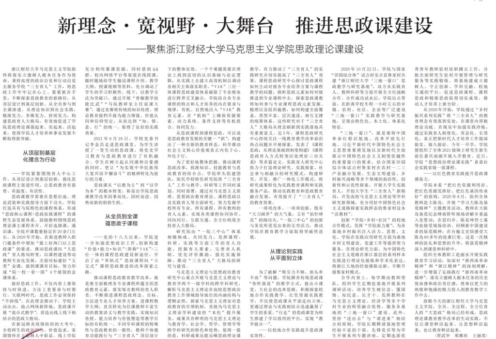 报道指出,浙江财经大学在习近平总书记3·18重要讲话精神和“三全育人”的理念指引之下,不断探索思政教育新路径,从顶层设计到基层创新,从理论知识到社会实践,精准发力、多维发力、持续发力,有效构建思政与人大格局。近年来我校思政课教学育人工作以问题为切入点,不断更新教学方法,开展了从“以教为主”到“以学为本”,从知识灌输到价值引领,从课堂教学到社会实践的三大转化,逐步形成了全员、全过程、全方位育人新格局,有力促进了课堂活起来,思想活起来,教育活起来。