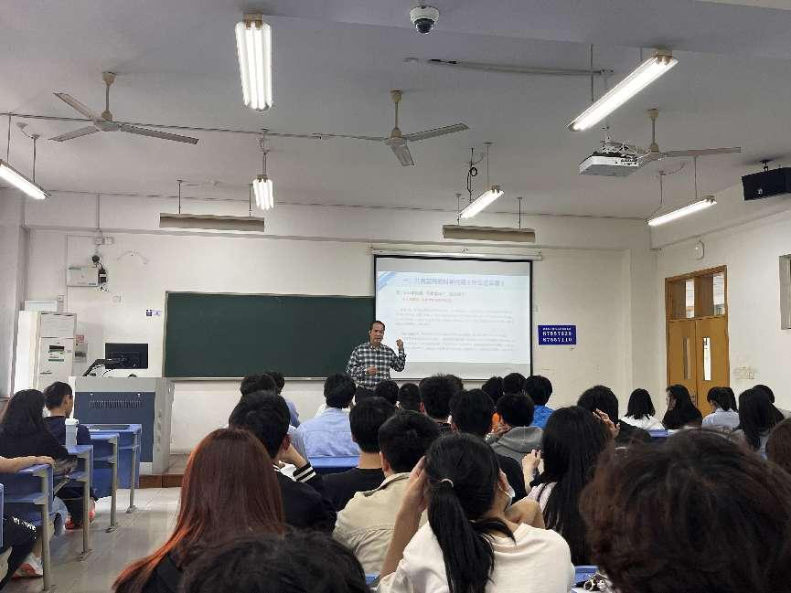 副校长李占荣结合自身专业以及过往的台湾调研与学术交流经历,以“站在历史正确一边,共创祖国统一伟业”为题,为法学院学生讲授了“台独”的本质和危害,分析了为什么祖国必须统一和统一是历史发展的必然。