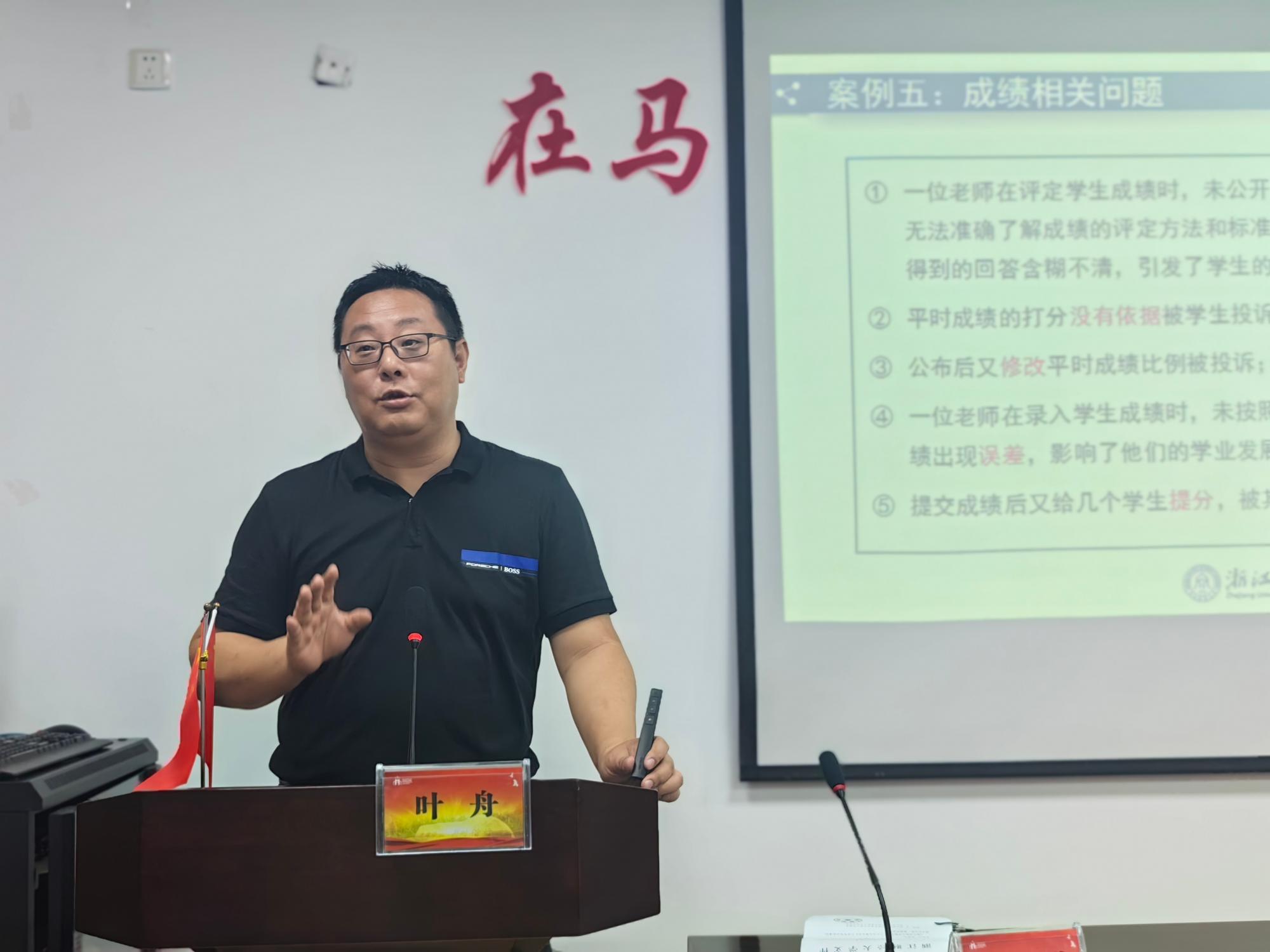 作题为“教学工作规范与教学事故防范”的培训会。叶舟围绕“课堂教学注意事项”“教师监考注意事项”“教师言行注意事项”三个方面就我校教学规范和本科教学质量提升进行讲解。叶舟以案说理,结合《浙江财经大学教学事故认定及处理办法》以及近年来发生在我校的各类教学事故,详细解读了各个教学环节的教学事故风险和注意事项,尤其强调了教师迟到早退、言行失范、监考不负责任等现象的危害,帮助老师们快速了解学校的教学工作规程、教学事故认定与处理办法等教学规范相关内容。叶舟副处长还结合自身长期教学工作经验,就如何落实教学常规、提升课堂教学质量进行了详实的讲解和指导,并强调了师德师风的重要性。