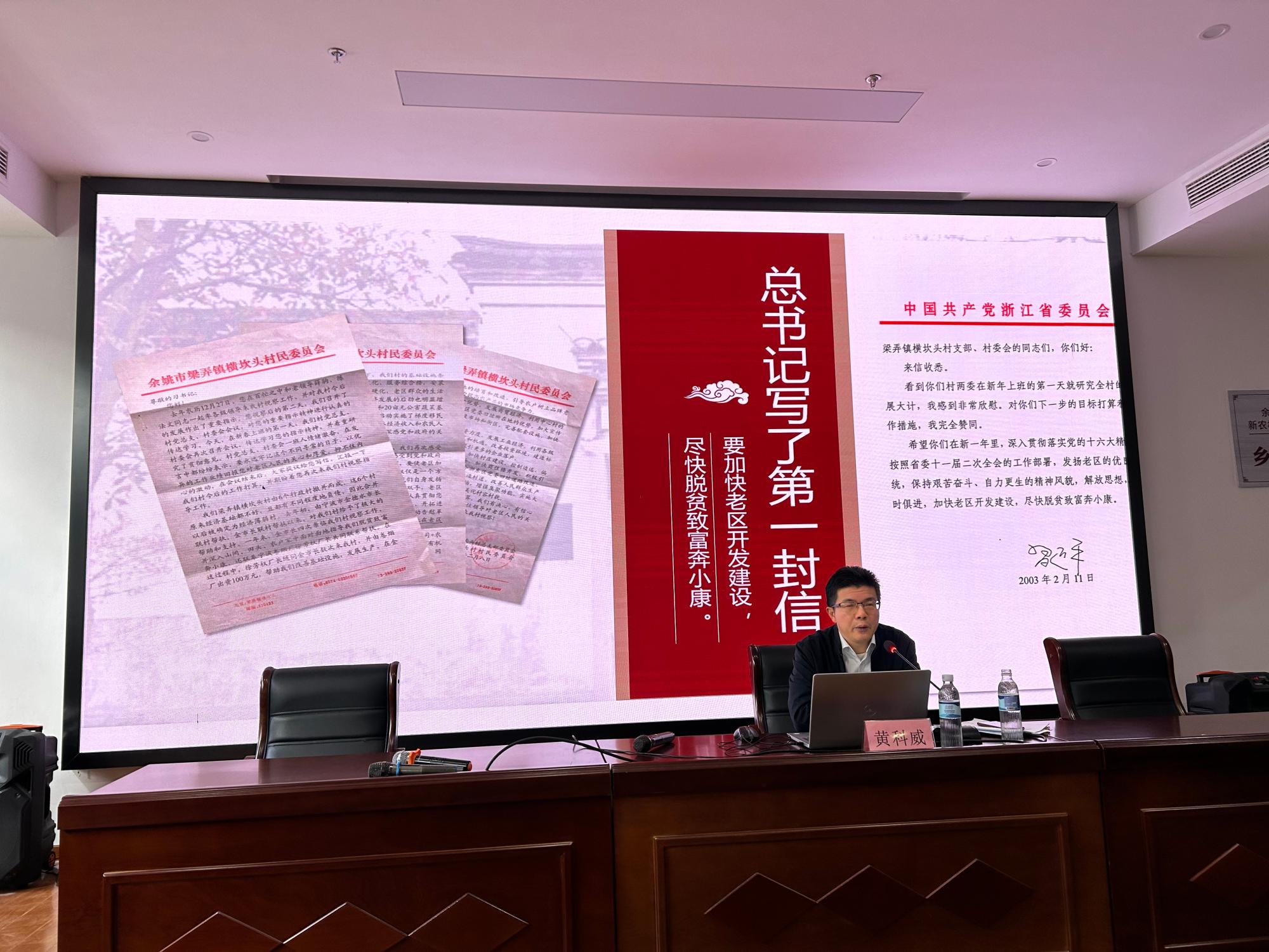 11月25日上午,横坎头村支书黄科威书记以“红色赋能乡村振兴”为主题为我校人文学院的学生讲了一堂生动的浙江乡村共同富裕课。黄书记讲述2003年习近平总书记曾到横坎头村视察工作时场景,以及习近平总书记给横坎头村的两封回信,希望他们“发扬老区的优良传统,保持艰苦奋斗、自力更生的精神面貌,解放思想,与时俱进,加快老区开发建设,尽快脱贫致富奔小康”。黄书记介绍了20年来,横坎头村在村党委班子的带领下,发扬老区人民艰苦奋斗、苦干实干精神,大力发展“红绿”融合的特色农旅产业,充分挖掘横坎头村历史优势、区位优势,打造浙东红村的历史过程,介绍了乡村产业发展和集体经济取得的成果。横坎头村为革命老区摆脱贫困实现共同富裕探索了一条新路径。