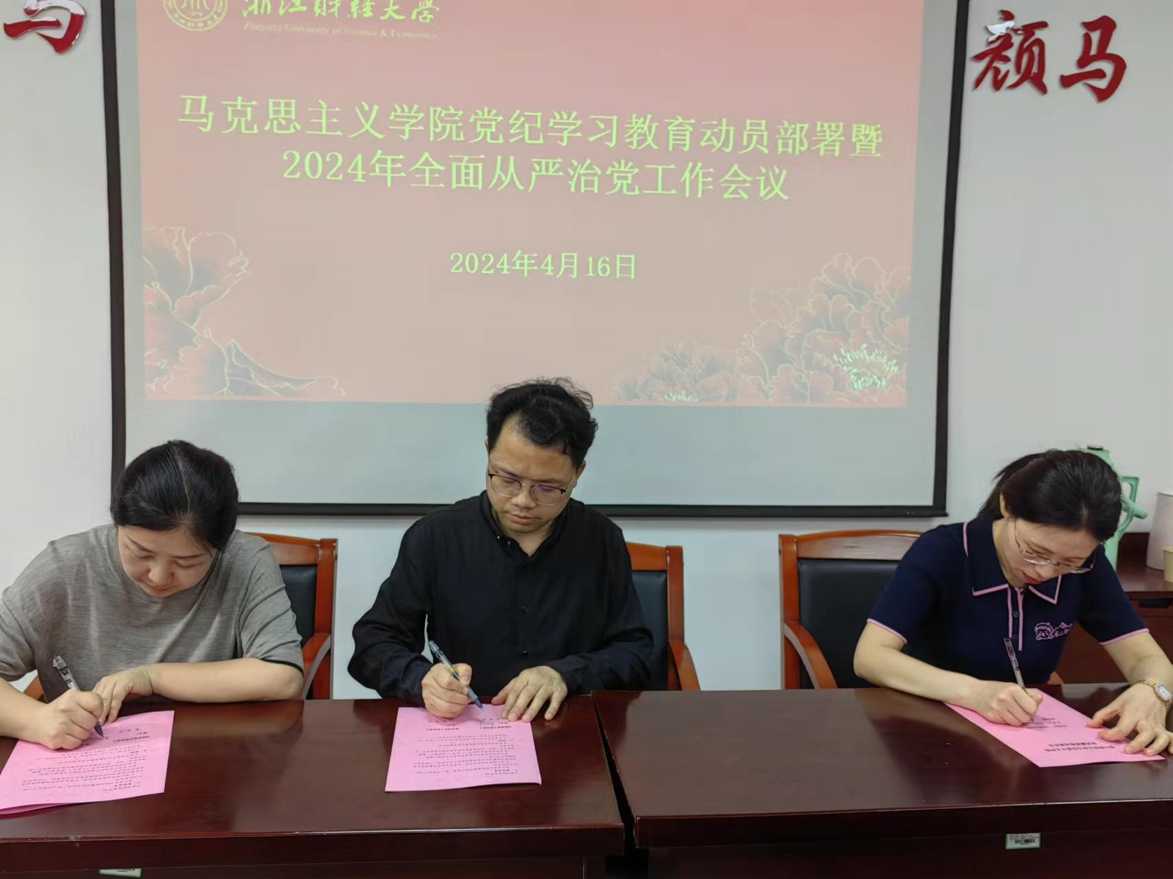 召开党纪学习教育动员部署暨2024年全面从严治党工作会议,传达学习贯彻习近平总书记关于党纪学习教育的重要指示精神和习近平总书记关于党的自我革命的重要思想,认真落实上级党纪学习教育动员部署会议精神和全面从严治党暨清廉学校建设推进会的要求,部署学院党纪学习教育工作和“清廉马院”建设工作。学院党政班子、党委委员、纪委委员、各教研室主任(副主任)、党支部书记、办公室主任、专职组织员等参加会议。会议由学院党委书记高燕主持。