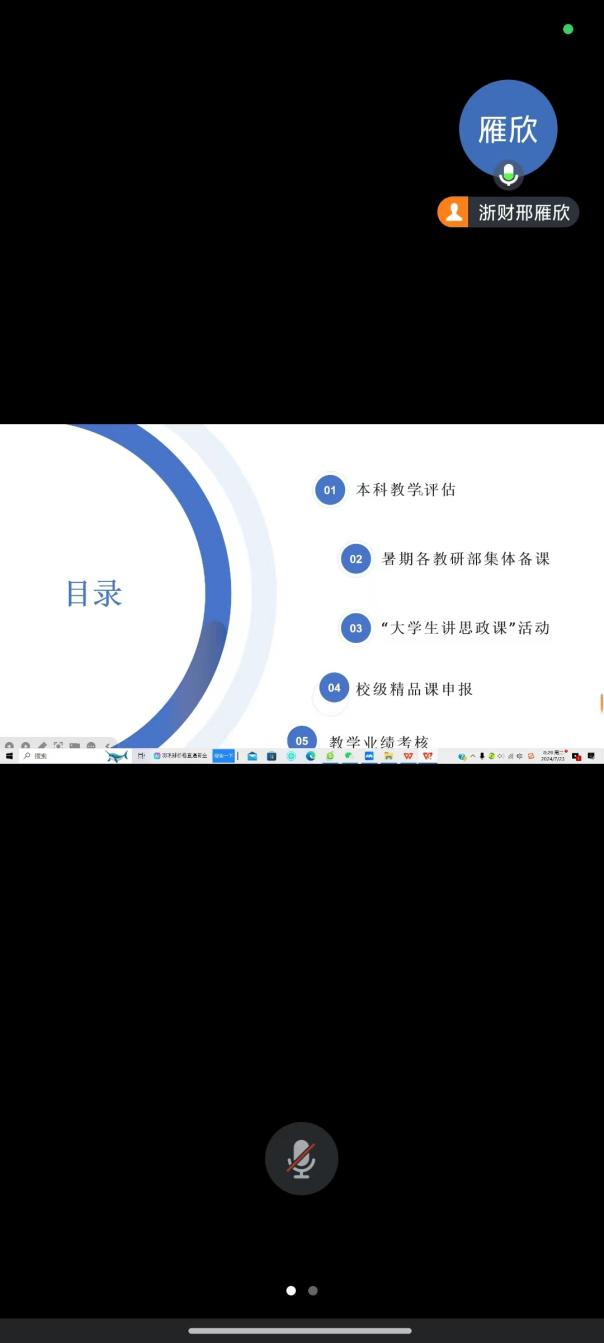邢雁欣首先安排下学期的本科教学评估工作,表明成立学院工作组,着重准备思政课课程材料、教学大纲、试卷存档等材料,明确相关工作要求和完成时间节点。其次部署了学院集体备课会工作,要求各教研部老师积极参与,并且要求各教研部暑期开展集体备课会。再次介绍了“关于开展习近平新时代中国特色社会主义思想大学习领航计划主题教育活动”的内容和要求,强调活动的重要性,鼓励学院全体思政课老师按照主题积极参与本次活动。接着布置了校级精品课建设的申报工作,强调了精品课建设对于学院提高教学质量、推动教学改革、增强学校竞争力等方面的重要意义,动员各教研部结合课程精品内容、教师精湛水平、教学精准效果等优势耐心打磨和细心雕琢。最后,说明了即将开展的2023-2024学年教学工作业绩考核的大概流程,并对细则进行了讨论。
