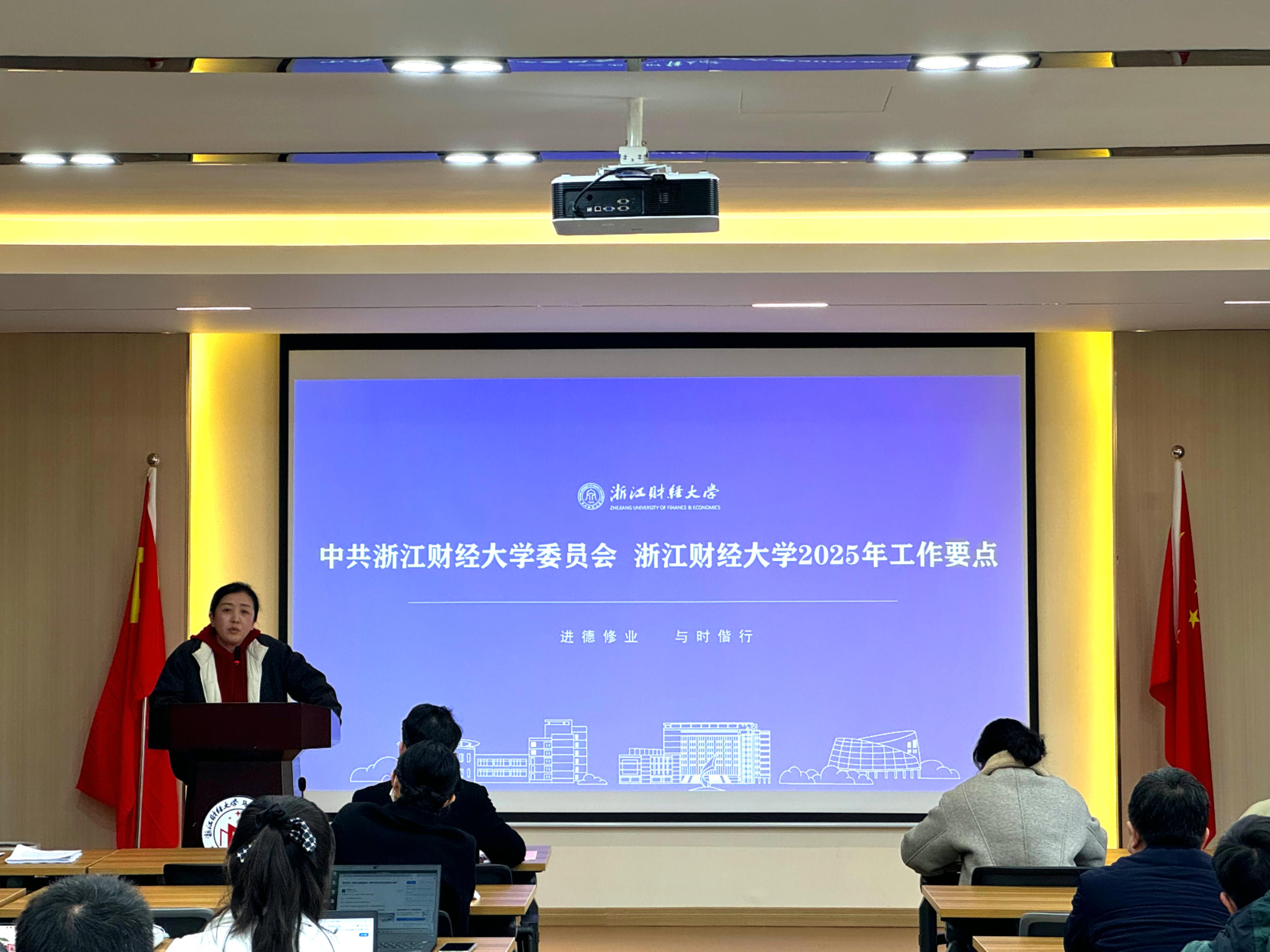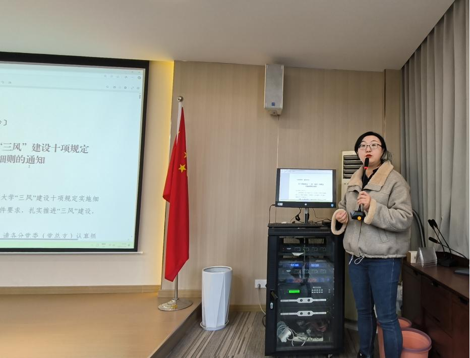 副院长邢雁欣现场领学《浙江财经大学“三风”建设十项规定》《浙江财经大学“三风”建设十项规定实施细则》等文件,并从思政课堂管理、听课评课、智慧化教学、教学实践、文化建设等五个方面对学院“三风”建设方案进行了介绍和解读。