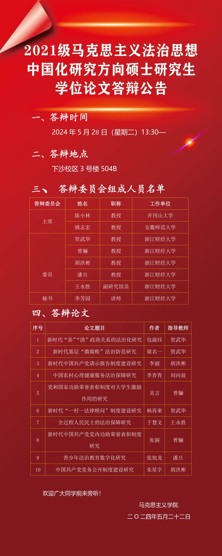 2021级马克思主义法治思想中国化研究方向硕士研究生答辩公告