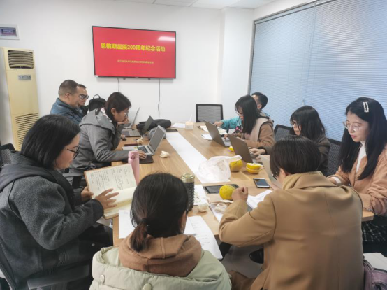 教工第一党支部及马克思主义基本原理概论教研室的全体成员在学院楼517A教研活动室举行“恩格斯的思想及当代价值”座谈会和原著品读分享会,纪念全世界无产阶级和劳动人民的伟大导师、马克思主义创始人之一的弗里德里希·恩格斯200周年诞辰。