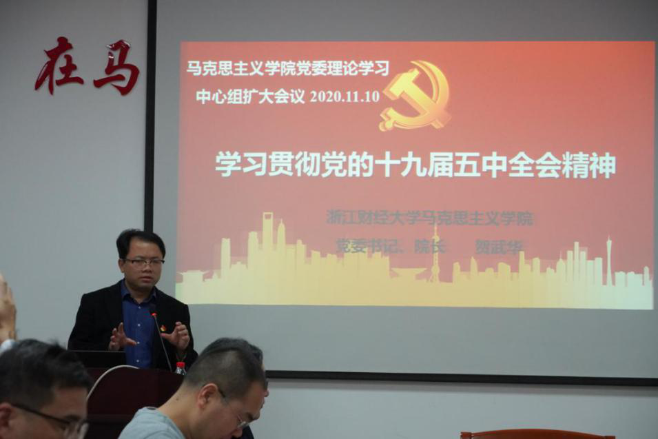 贺武华从阐述党的十九届五中全会召开的时代背景、重要意义出发,重点分析了《中共中央关于制定国民经济和社会发展第十四个五年规划和二〇三五年远景目标的建议》的起草过程、主要内容以及特色亮点等内容。大家一致认为,党的十九届五中全会,是在统筹中华民族伟大复兴的战略全局和世界百年未有之大变局的关键时刻,在“两个一百年”历史交汇点上召开的一次重要会议,举世瞩目,意义重大,影响深远。《建议》擘画了“十四五”乃至二〇三五年我国发展的宏伟蓝图,开启了全面建设社会主义现代化国家新征程,是今后五年乃至更长时期我国经济社会发展的行动指南。