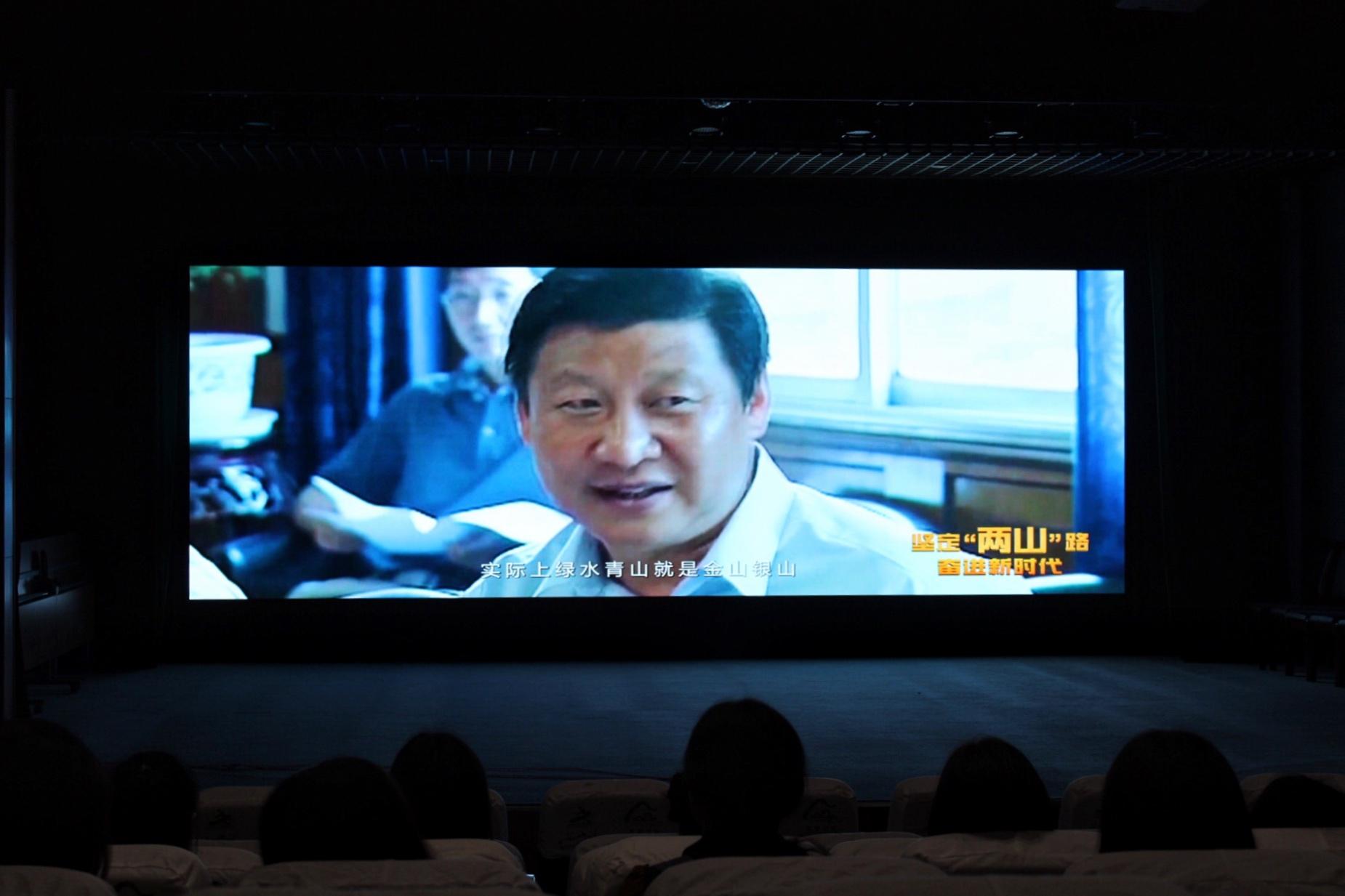在余村的电影院观大家观看了时任浙江省委书记的习近平同志来到余村考察的座谈会视频,短片中习近平总书记说:“你们下决心停掉一些矿山,这是高明之举。我们过去讲既要绿水青山,又要金山银山,其实绿水青山就是金山银山。”总书记还说,生态资源是最宝贵的资源,人与自然的和谐,总是有所为、有所不为,不要以环境为代价去推动经济增长,因为这样的增长不是发展。