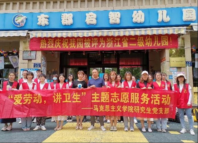 研究生支部新发展党员在老党员的带领下,于2021年5月27日赴杭州启智幼儿园开展党员进学校服务育新苗“爱劳动、讲卫生”的志愿者服务活动,以实际行动践行初心使命,争做示范表率。
