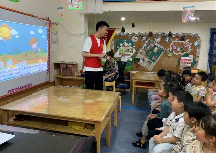 活动开始,党员志愿者们3人为一组,为幼儿园的大班及中班的各个班级的小朋友们普及劳动节的由来,认识劳动模范,通过绘画比赛和PPT授课的形式,引导孩子们珍惜劳动果实,厉行勤俭节约,履行光盘行动。