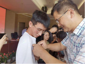 新生硕士生导师为21级研究生新生佩戴校徽并赠送书籍。