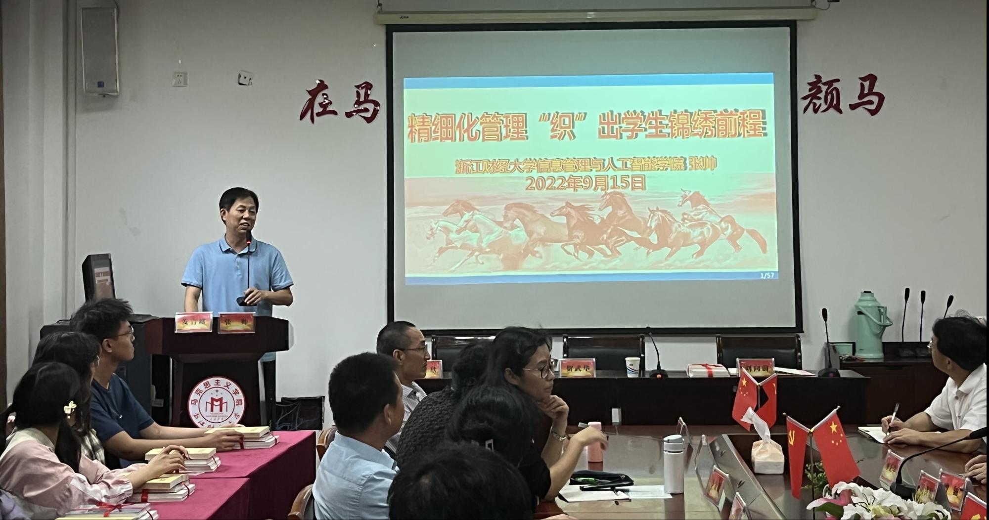 特邀嘉宾,来自信息技术与人工智能学院的院长张帅教授作专题发言。张院长以“精细化管理,织出学生锦绣前程”为主题,向大家分享了信智学院多年来培养研究生的丰硕成果与实践经验,并将他们总结的多项培养举措一一向大家说明,在场的老师和同学都受益匪浅。