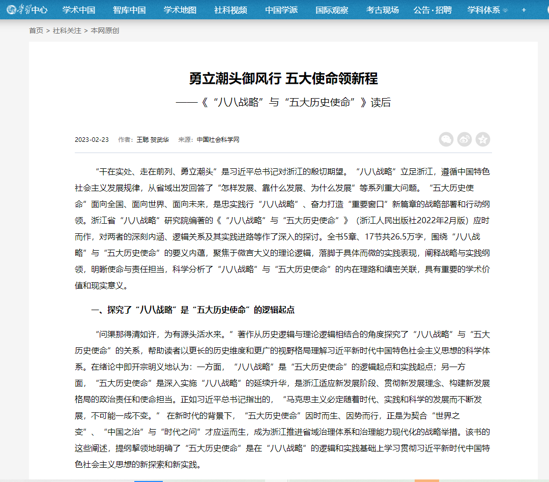 《中国社会科学网》2023年2月23日刊发了肉漫画 教师王聪、贺武华的文章:《勇立潮头御风行 五大使命领新程——《“八八战略”与“五大历史使命”》读后,全文如下: